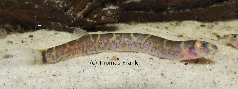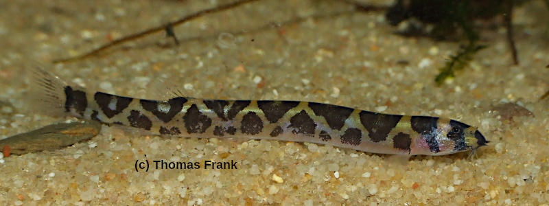 In der Zeichnung scheint diese Art sehr variabel zu sein, mit deutlich unterschiedlichen Marmorierungen. Bei einigen Tieren ziehen sich das gelbe Linienmuster vom Rücken bis zur Bauchseite, bei anderen gerade mal bis zur Körperhälfte. Auch die intensität der sich auflösenden Zeichnung in der unteren Körperhälfte schwankt von Tier zu Tier start. Die Schwanzflossenzeichnung ist aber bei allen absolut gleich, weshalb ich auch erst mal davon ausgehe das es sich wirklich um die gleiche Art handelt. Natürlich ist es auch möglich, dass es sich um verschiedene Arten mit gemeinsamen Vorkommen handelt. Kottelat beschreibt die Zeichnung als 6 bis 9 dreieckige dunkle Sattelflecken. Dazu kommen in der mittleren und unteren Körperhälfte unregelmäßige Flecken auf hellem oder rosafarbenem Grund. Bisher habe ich erst ein einziges Dornauge mit den beschriebenen dreieckigen Sattelflecken finden können, alle anderen gekauften "alternans" zeigen das übliche durcheinander an Möglichkeiten der Musterung. Hier ist es zu sehen.