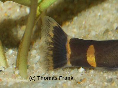 Ein weiteres Merkmal dieser Downaugen ist ein senkrechter Balken/Strich hinter dem dunklen Bereich in der Schwanzflosse. Aber auch diesen Strich haben nicht alle P. myersi, aber wenn er da ist, dann sind es die "Riesendornaugen". Es kann auch vorkommen das die Schwanzflosse einfach ganz schwarz ist.